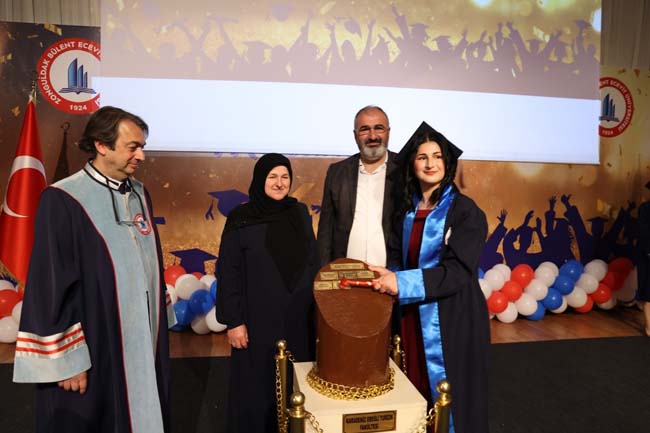 2024-2025 Akademik Yılı Ereğli Eğitim Fakültesi mezuniyet töreni, açılış konuşmalarının tamamlanmasının ardından fakülte birincisi Zehra Ögtem’in konuşmasıyla devam etti. Konuşmasında BEUN Rektörü Prof. Dr. İsmail Hakkı Özölçer’e fakülteye vermiş olduğu katkılardan dolayı teşekkür eden Ögtem, devamında ise kendilerini yetiştiren akademisyenlere ve büyük emek veren ailelerine teşekkür etti. Tören, fakülte birincisi Zehra Ögtem’in ailesiyle birlikte mezuniyet kütüğüne isminin yer aldığı plakayı çakmasıyla devam etti. Törenin devamında ise fakülte bölümlerinde dereceye giren öğrencilere protokol üyeleri tarafından başarı belgeleri takdiminde bulunuldu. Dereceye girenlere verilen ödül ve mezuniyet belgesi takdiminin ardından ise mezuniyet yemini gerçekleştirildi. Mezunların yemin etmesinin ardından kep atma törenine geçilirken büyük coşkuyla gerçekleştirilen tören, hatıra fotoğrafı çekilmesiyle sona erdi.