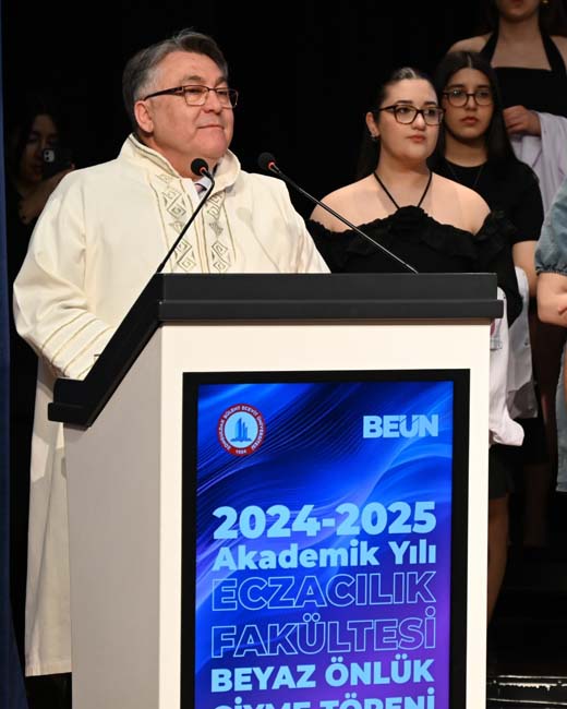 "Eczacı adayı öğrencilerimizin eğitim ve meslek hayatı boyunca giyeceği beyaz önlükler; yalnızca bir giysi değildir. Saflığı, temizliği, dürüstlüğü, saygıyı ve meslek ahlakını temsil ettiği gibi; sizlerin alın terini, çalışkanlığını ve onurunu da temsil edecektir. Beyaz önlüğünüz, onu gururla giyip gülen yüzlerinizle şifa arayanlara umut olduğunuzda; hastalarınızın duası ve yakınlarının teşekkürü ile daha da değerlenecektir. Şunu unutmayınız ki eczacılık, özveri ve bağlılık gerektiren bir meslektir. İnsanların hayatına dokunan, onların sağlık ve refahını gözeten sizler, toplumun güvenini ve saygısını kazanacak, büyük bir sorumluluğu omuzlayacaksınız. Üniversitemizin sizlere kazandıracağı vizyon ile ülkemize, milletimize ve tüm insanlığa değer katacağınıza canıgönülden inanıyorum. Geleceğimizin aydınlık yüzü olan sizleri bugünlere getiren fedakâr ailelerinize huzurlarınızda tekrar teşekkür ediyorum. Eczacılık Fakültemizin gelişmesine değer katan güçlü akademik ve idari kadromuzu ayrı ayrı tebrik ediyor, hepinize başarılar diliyorum."