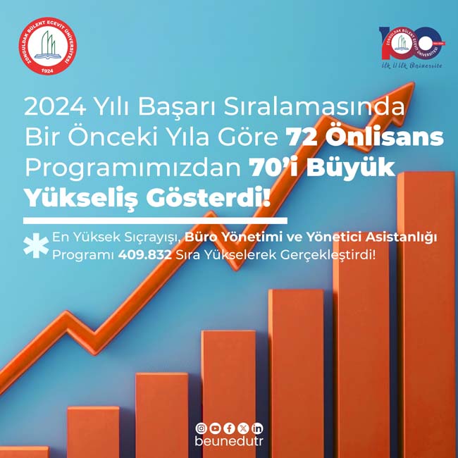 Zonguldak Bülent Ecevit Üniversitesi (BEUN), 2024 YKS tercih sonuçları bir önceki yıla göre 44 lisans programından 31 lisans programı ile 72 ön lisans programından 70 ön lisans programını tercih eden öğrenci başarı sıralamalarında büyük bir sıçrayış gösterdi. Özellikle başarı sıralamasında birinci olan İnsan ve Toplum Bilimleri Fakültesi Tarih Bölümünün geçen yıla oranla 228.278 öğrenci başarı sırası farkı göstermesi dikkat çekti. İkinci sırada yer alan Denizcilik Fakültesi Denizcilik İşletmeleri Yönetimi Bölümü 163.137 basamak birden yükseldi. Üçüncü sırada yer alan İktisadi ve İdari Bilimler Fakültesi Çalışma Ekonomisi ve Endüstri İlişkileri Bölümü ise 149.582 basamak yükseliş kaydetti.