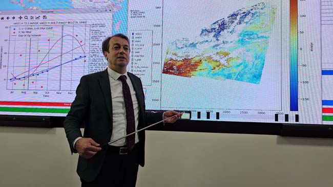 "Bu sayede ne olabilir ne elde ederiz? Yer hareketi olan yerleri rahatlıkla tespit edebiliyoruz. Harita üzerinde tıkladığımızda herhangi bir bölgedeki seçtiğimiz zaman aralığındaki hareketleri zamanla değişen boyutta tespit edebiliyoruz. Böylece yer bilimciler aktif eylemleri tespit etme, fay hatlarını tespit etme, hangi faylar ölü, hangi faylar aktif bunları belirleme, fayların uzunluğunu, bu uzunluğa bağlı olarak ortaya oku çıkartabilecekleri depremin büyüklüğü gibi parametreleri çözmemiz mümkün. Böylece de zarar azaltma çalışmalarını yürütmek mümkün hale geliyor. Biz bu yazılımı kendimiz için değil, bütün ülkemizdeki yerbilimciler için gerçekleştirdik. Sadece kendimiz kullanmaya kalkarsak, buradaki her bir ayrıntıyı çalışmak, buradan sayısız yayın çıkabilir, binlerce yayın çıkabilir. Bizim ömrümüz bu kadar yayını yapmaya yeterli değil. Bugünden itibaren rektörümüzün de talimatıyla biz bu uygulamayı ülkemizdeki ilgi duyan tüm yer bilimcilerin kullanımına açacağız. Program dediğimiz gibi bizim sunucularımız üzerinde kurulu durumda."