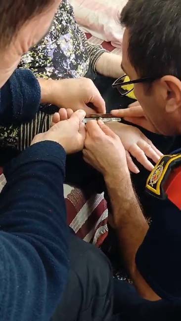 Zonguldak’ta bir kadının sağ el bileğinin şişmesi sonucunda sıkışan bileziğini, itfaiye ekipleri keserek çıkardı.