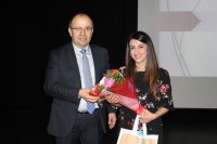 Prof. Dr. Kemal Büyülgüzel'in Pelin Karaburun'a çiçek ve hediye takdimi ile