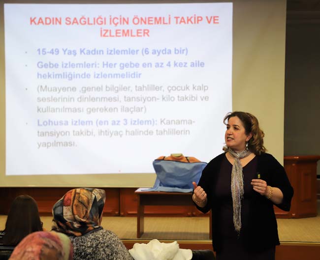 İl Sağlık Müdürlüğü Halk Sağlığı Hizmetleri Başkanlığı, Çocuk, Ergen, Kadın ve Üreme Sağlığı - Kanser Birim Sorumlusu Dr. Nilgün Keloğu, Eğitimciler Uzm. Dr. Mehmet Gökdeniz, Hemşire Kadriye Özdemir ve Hemşire Duygu Akşahin tarafından gebeliğe hazırlık, riskli gebelikler, dikkat edilmesi gereken konular, doğum öncesi izlemler ve bakım, doğum ve lohusalık süreci, bebek izlemleri ve dikkat edilecek konular, yenidoğan tarama programı, anne ve bebek hijyen kuralları, anne sütü ve önemi, üreme sağlığı ile akılcı ilaç kullanımı konularında bilgiler verildi.