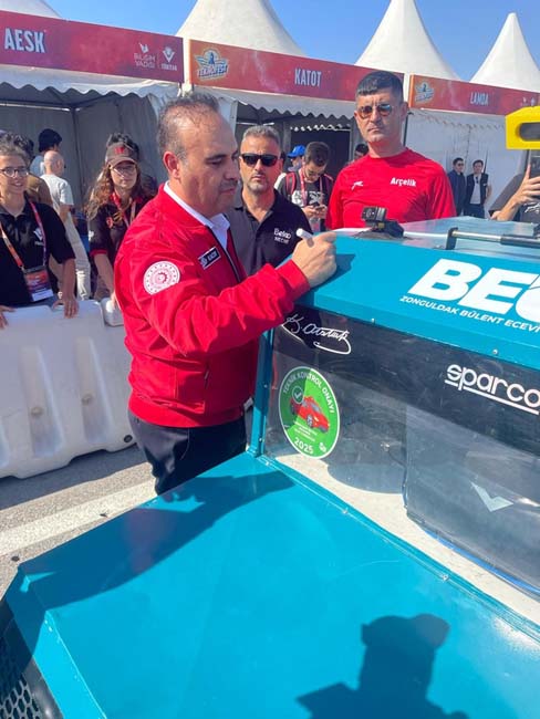 Final heyecanı sürerken, yarışma alanında Baykar Yönetim Kurulu ve TEKNOFEST Yönetim Kurulu Başkanı aynı zamanda Türkiye Teknoloji Takımı Vakfı (T3 Vakfı) Mütevelli Heyeti Başkanı Selçuk Bayraktar, Sanayi ve Teknoloji Bakanı Mehmet Fatih Kacır ve TÜBİTAK Başkanı Prof. Dr. Orhan Aydın, ZBEÜ OVAT Takımı’nı ziyaret etti. Takımın geliştirdiği araç hakkında öğrencilerden bilgi alan konuklar, gençlerle yakından ilgilenerek araca imza attı ve başarı dileklerini iletti.