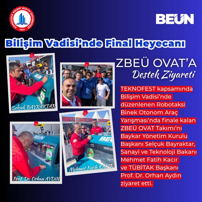 TEKNOFEST kapsamında Bilişim Vadisi’nde düzenlenen Robotaksi Binek Otonom Araç Yarışması’nda finale kalan ZBEÜ OVAT Takımı’nı Baykar Yönetim Kurulu Başkanı Selçuk Bayraktar, Sanayi ve Teknoloji Bakanı Mehmet Fatih Kacır ve TÜBİTAK Başkanı Prof. Dr. Orhan Aydın ziyaret etti. Selçuk Bayraktar, Bakan Fatih Kacır ile TÜBİTAK Başkanı Prof. Dr. Aydın, BEUN’lu genç mühendislerle bir araya gelerek kendilerine başarı dileklerinde bulundu.