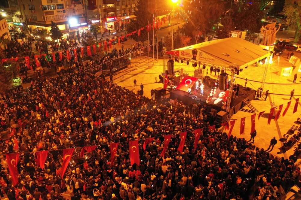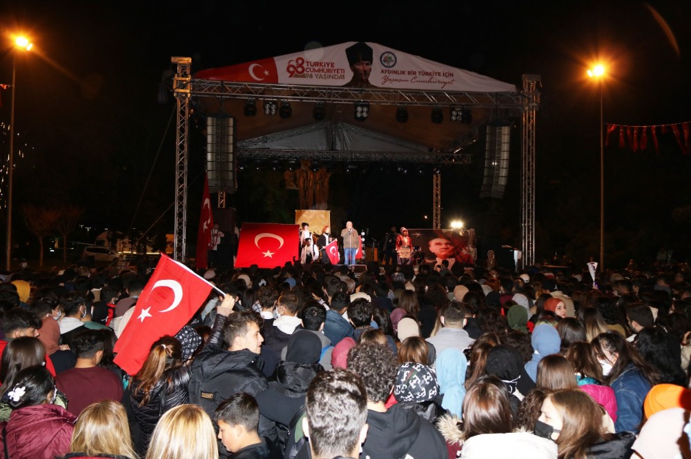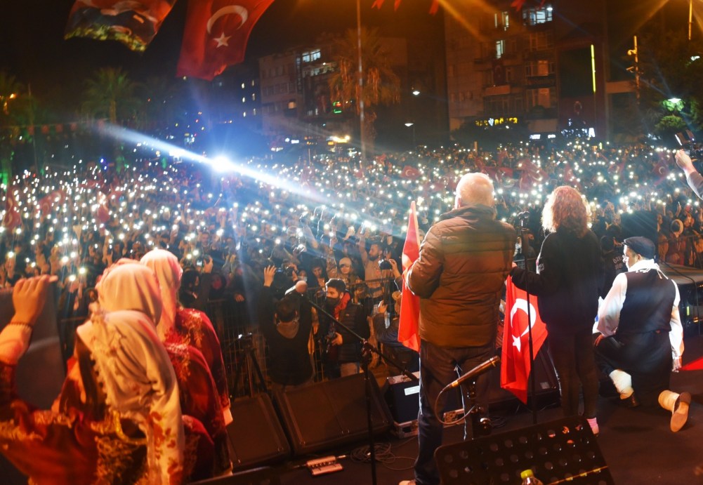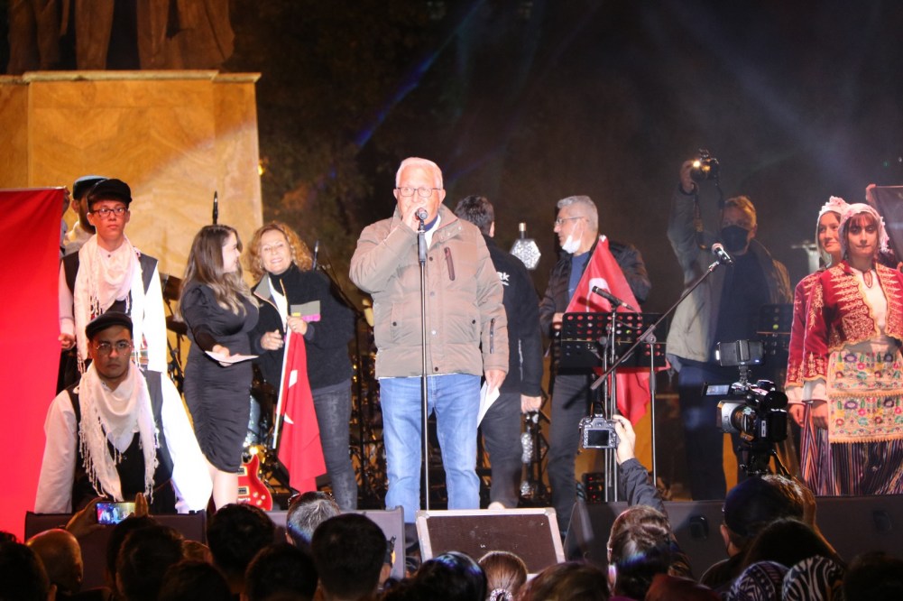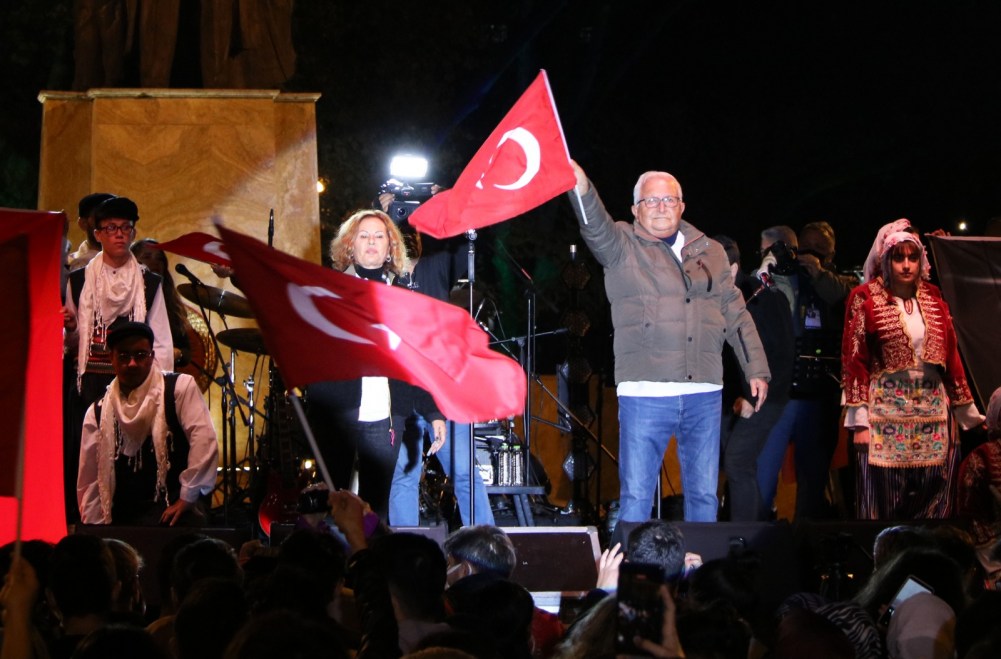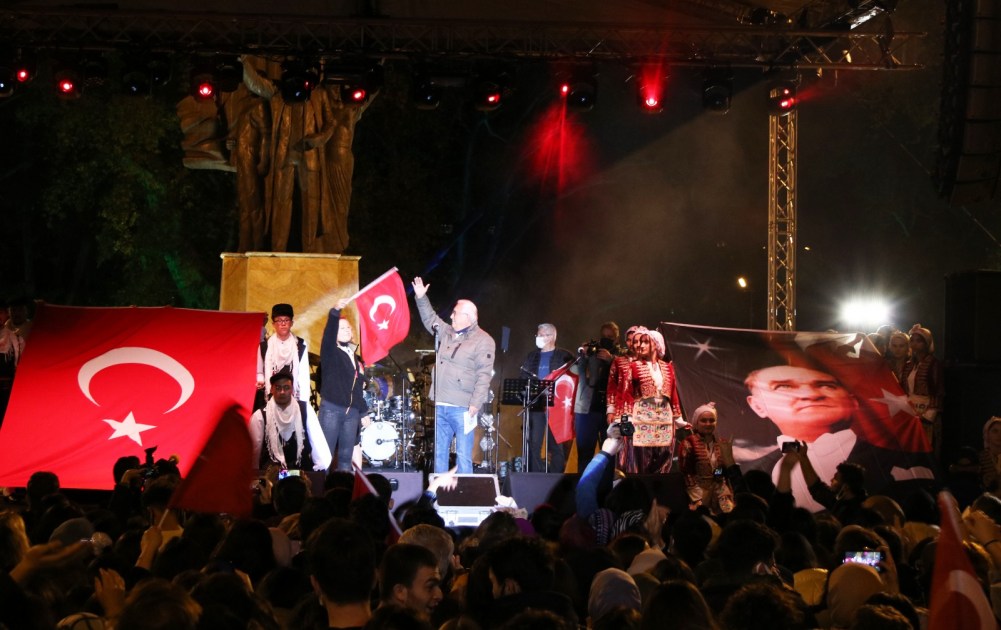 “Cumhuriyetimizin kuruluşunun 98. yılını büyük bir coşkuyla kutluyoruz. Az önce Fener Alayında, hepimiz cumhuriyetimiz için heyecanla tek yürek olduk, marşlarımızı söyledik. Kalbimizde Atatürk’le, ellerimizde Türk Bayrağı’yla sular gibi yollardan aktık, meydanları doldurduk. Birazdan sanatçımız Gökhan Türkmen’in konserini dinleyeceğiz.