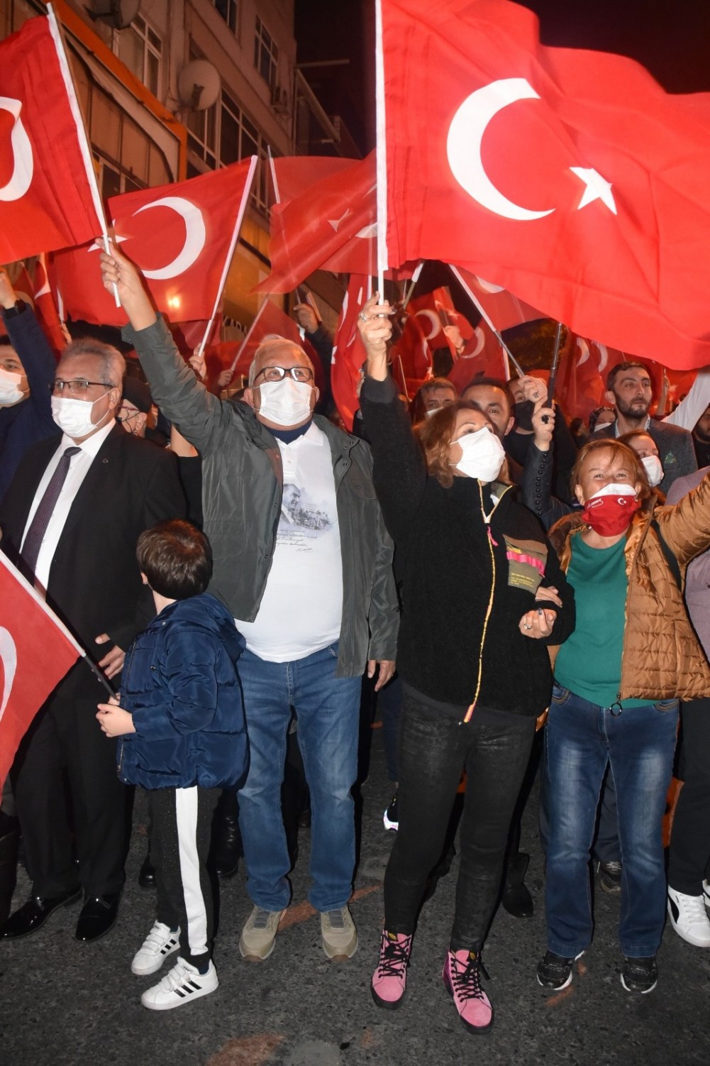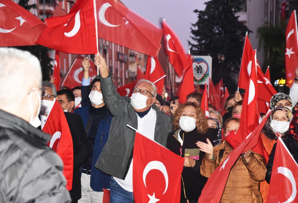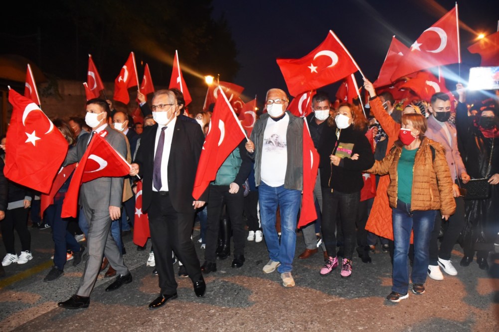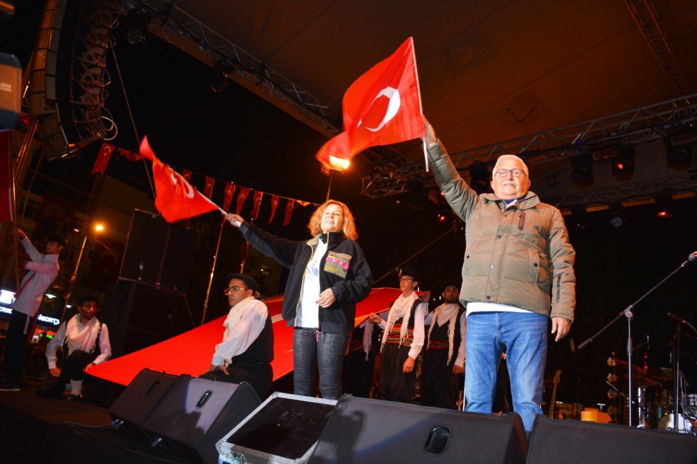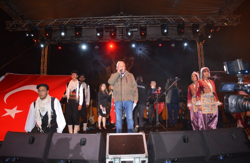 Belediye Başkanı Halil Posbıyık, Cumhuriyet yürüyüşüne katılan halka anıt önünde kurulan sahneden seslenerek “Cumhuriyet değerlerine birlikte sahip çıkacağız” dedi.
