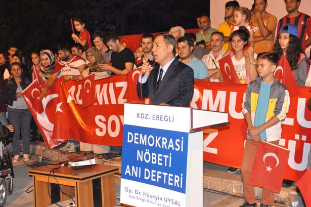 Kdz.Ereğli Belediye Başkanı Hüseyin Uysal, darbe girişiminin hemen ardından İlçedeki 5 siyasi parti İlçe Başkanıyla belediyede bir araya gelerek başlattığı demokrasi nöbetinin 10.gecesinde, Kdz.Ereğli halkıyla beraber sabahın ilk ışıklarına kadar demokrasi nöbetini sürdürdü.