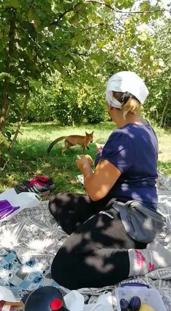 Düzce'de Dilek Şen isminde bir kadın, fındık toplamak için girdiği bahçede yemek yerken karşılarına çıkan tilkiyle sohbet etmeye başladı. Elleriyle tilkiye ekmek kırıntıları veren Dilek Şen, ekmeği beğenmeyen tilkiye poğaça vererek beslemeye devam etti. O anları ise cep telefonuna çekerek ölümsüzleştirdi.