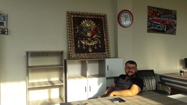 İlçede esnaflık yapan Burak Köseler, eline aldığı telefonu ile işyerinin yazıhanesine gelerek masasına oturdu. Bir süre telefonuyla oynayan Köseler'in arkasındaki Osmanlı Tuğrası'nın yer aldığı tablo bir anda Köseler'in başına düştü.