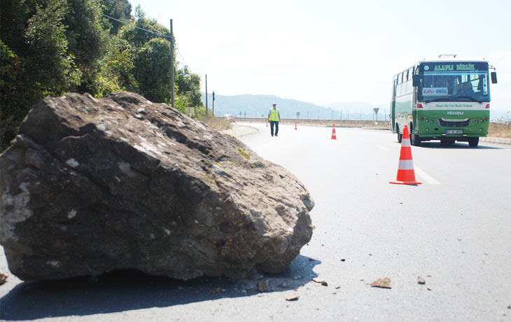 Kdz. Ereğli-Düzce arasındaki karayolunun tersaneler bölgesinde kayalıklardan karayoluna büyük bir kaya parçası düştü. Sürücülerin haber vermesi üzerine olay yerine gelen trafik ekipleri yol üzerinde işaretleme yaparak trafiği kontrollü olarak bir süre tek şeritten verdiler. Trafik ekipleri karayolları yetkililerine durumu bildirerek kaya parçasının yoldan kaldırılmasını istediler. Karayolları ekipleri uzun süre gelmeyince bu sefer Ereğli Belediyesi'nden kepçe istendi. Kısa sürede tersaneler bölgesine gelen Kdz. Ereğli Belediyesi'ne ait kepçe, kaya parçalarını yoldan kaldırarak yolun yeniden trafiğe açılmasını sağladılar.