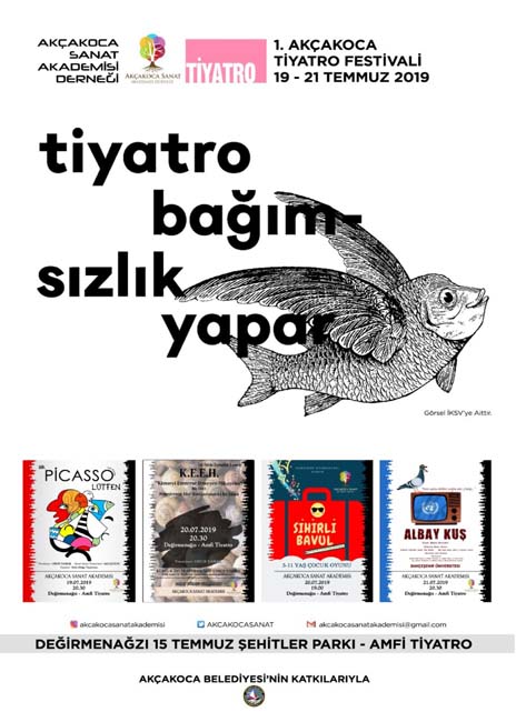 Sanatın; edebiyatı, müziği, tiyatroyu, sanatçıyı sanatseverlerle buluşturarak keyifli bir sanat iklimini oluşturacağı 1. Akçakoca Tiyatro Festivalinde siz değerli tiyatro ve müzik severleri bekliyoruz. “Tiyatro Bağımsızlık Yapar” ana başlığında gerçekleşecek 1. Akçakoca Tiyatro Festivali 19 - 20 - 21 Temmuz’da Akçakoca’da…
