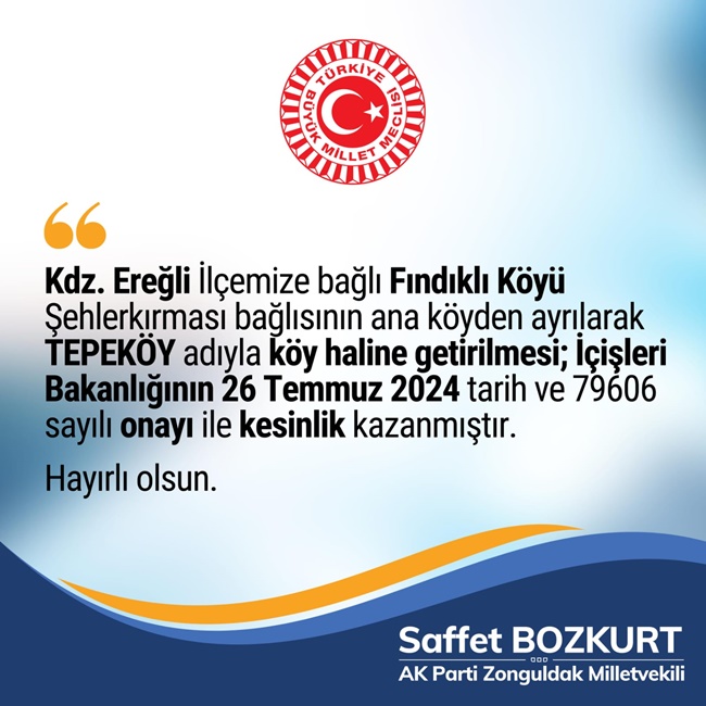 AK Parti Zonguldak Milletvekili Saffet Bozkurt, bir açıklama yaparak, Fındıklı'ya bağlı bir mahallenin de Tepeköy adıyla köy haline getirilmesinin İçişleri Bakanlığı'nın onayı ile kesinlik kazandığını duyurdu.
