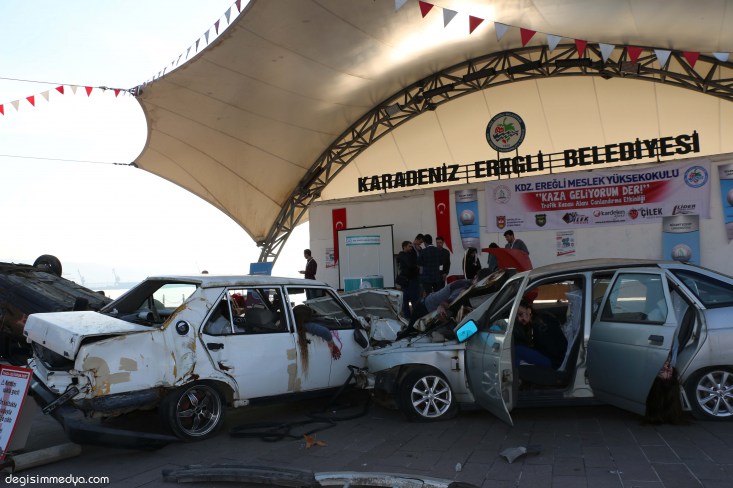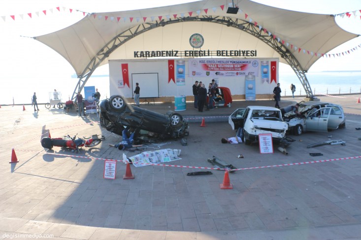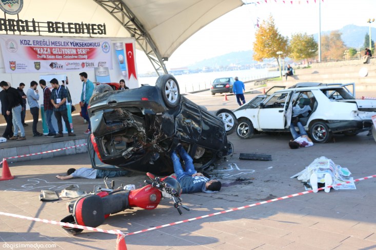 Ereğli Sahil kesiminde yer alan Amfi Tiyatro gerçekleştirilen etkinlikte, Türkiye'nin önde gelen sorunları arasında yer alan trafik kazalarına ve nedenlerine dikkat çekildi. Öğrenciler muhtemel bir trafik kazası sonrasında oluşan kaza sonrası görüntüyü kurguladılar.
