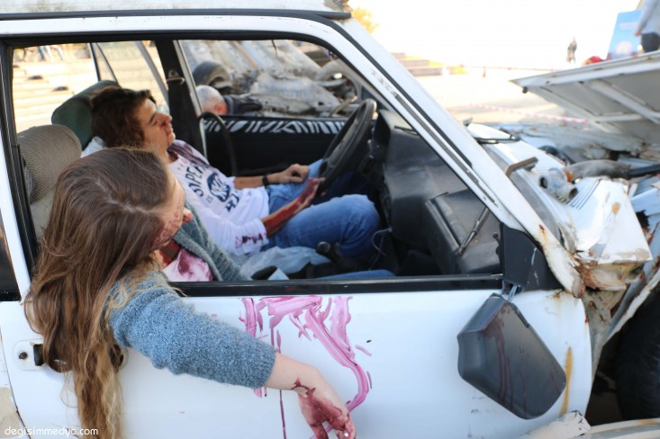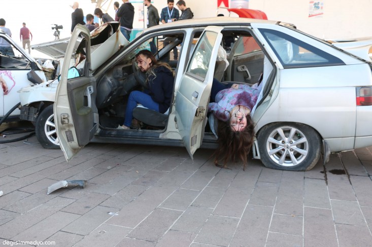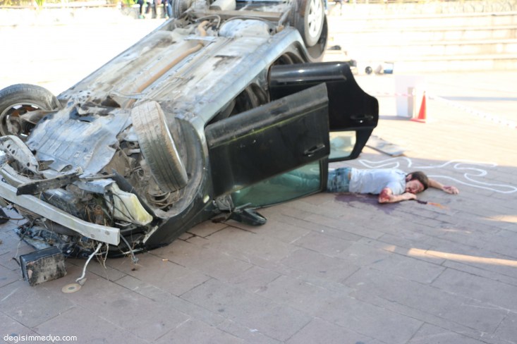 Senaryoya göre, 3 Otomobil ve 2 motosikletin karıştığı kaza bölgesinde araçların, yaralı ve ölen kişilerin durumu görsel unsurlar ve ses efektleriyle canlandırıldı. Gün boyu devam eden etkinlik kapsamında video gösterileriyle trafik kazalarının sebepleri ve çözüm önerilerine dikkat çekildi.