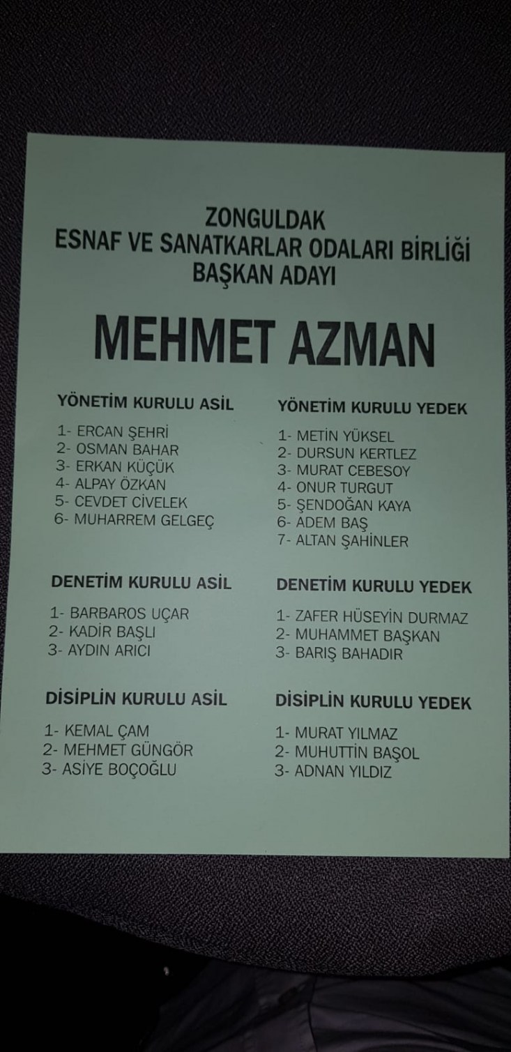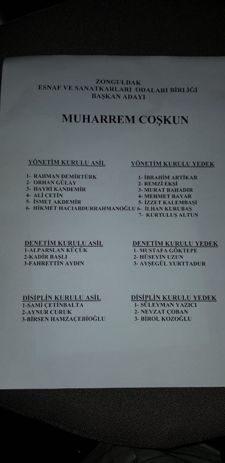 Zonguldak Esnaf Odaları Birliği seçimleri tamamlandı. Mevcut Başkan Muharrem Coşkun ve Mehmet Azman'ın yarıştığı seçimlerde Muharrem Coşkun yeniden başkanlığa seçildi.