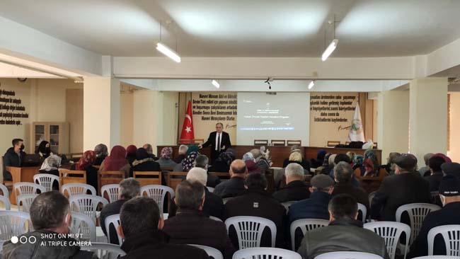 Toplantıya İl Tarım ve Orman Müdürlüğü’nden Ziraat Mühendisleri Abdullah Arslan, Tuğçe Üstün ve Osman Karaköse sunum ve anlatımları ile katılım sağladı. 65 çiftçi katılım sağladığı toplantıya köy muhtarı Mehmet Durguncu ile İlçe Müdürlüğü Ziraat Mühendisleri de katıldı. Toplantının açılışında konuşan Çaycuma İlçe Müdürü Coşkun Ulutaş; " Bitki Sağlığı ve insan sağlığının birbiri ile ilişkin olması nedeniyle bitkisel üretim yapan biz üreticilerin üretimde her aşamada hassas davranma zorunluluğumuz ve sorumluluğumuz vardır. Siz üreticilerimize zirai mücadele, biyolojik tedbirler ve kuralları, bu konularda yapılması gerekenler hakkında bilgilendirme yapacağız. Üretimimizin her aşamasında bilinçli olmak durumundayız. Sağlıklı ürünler yetiştirerek insan sağlığına da olumlu etki yapmış olacağız. Bunun için bu tür bilgilendirme ve katılımlar önemlidir. Bu nedenle katılımınız dolayısıyla muhtarıma ve sizlere teşekkür ederim" dedi.