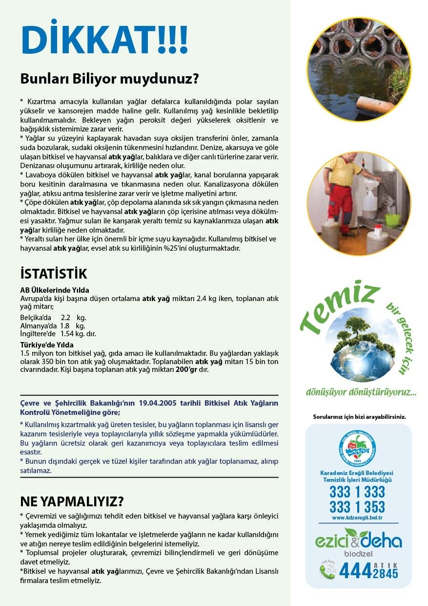 Kdz. Ereğli Belediyesi, son 15 yılda 100 ton bitkisel atık yağ toplayarak geri dönüşüme gönderdi. Kentin 30 ayrı noktasına kurulan Tekstil Atık kumbaralarıyla da son 4 yılda 107 ton kullanılmış giysi toplanarak geri dönüşüme kazandırıldı. 5 litre atık yağa karşılık bulaşık deterjanı veriliyor.