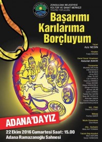 Zonguldak BKM Tiyatro Topluluğu 22 Ekim 2016 Cumartesi günü Aziz NESİN'in yazdığı "Başarımı Karılarıma Borçluyum" oyunuyla Adana'da sahne alacak.