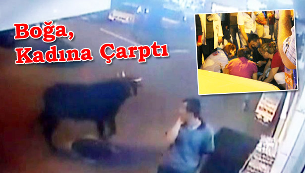 Öte yandan boğanın kadına çarpma anı bir işyerinin güvenlik kamerasına yansıdı.