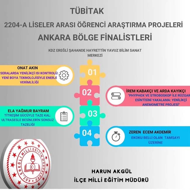 TÜBİTAK 2204 A Lise Öğrencileri Araştırma Projeleri Yarışmasına Karadeniz Ereğli’deki Şahinde Hayrettin Yavuz Bilim ve Sanat Merkezi (BİLSEM) öğrencilerinden 4 proje yarışmaya katılacak.