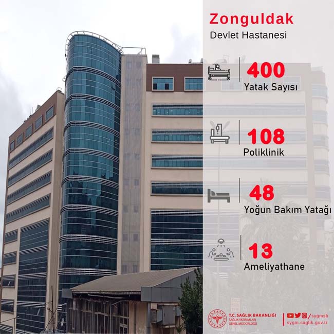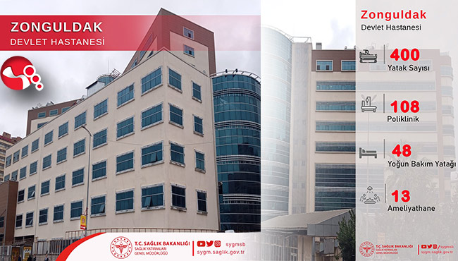 "Batı Karadeniz’in en önemli sağlık tesislerinin başında gelecek, bölgenin sağlık üssü olarak hizmet verecek 400 yataklı Zonguldak Devlet Hastanesi'nin inşaatı tamamlandı. Son teknolojiye sahip cihazlarla hizmet verecek hastanede her branştan 108 poliklinikte hasta kabulü yapacak."