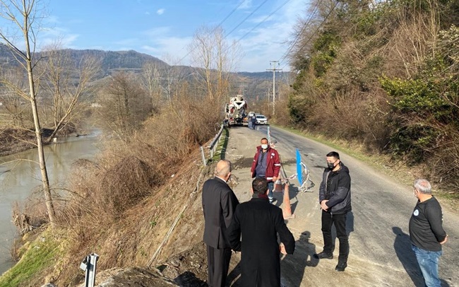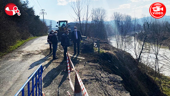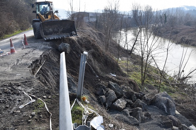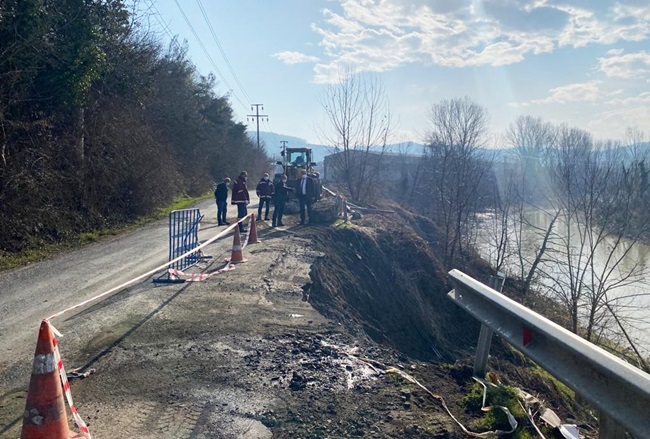 Belediye Başkanı Halil Posbıyık, bölgeye giderek yapılan çalışmaları yerinde denetledi. Şu anda tek şeritten sağlanan trafik, taş dolguyla çift şeride çıkartılarak yol güvenli hale getirilecek.