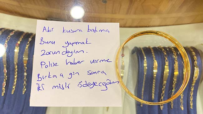 İşyeri sahibinin daha büyük bir bileziği göstermesi üzerine fiyatını soran İ.B., bileziğin içerisine isim de yazdırmak istedi. Fiyatta anlaştıktan sonra kredi kartı ile ödeme yapacağını söyleyen İ.B., işyeri sahibine yönelerek “Kusura bakma yapmak zorundayım” deyip notu tezgaha bıraktı. 8 bin 500 lira değerindeki bileziği de alarak kaçmaya başladı. Danış bilezikle kaçan İ.B.’yi tezgahın arkasından yakalamaya çalışsa da başarılı olamadı.