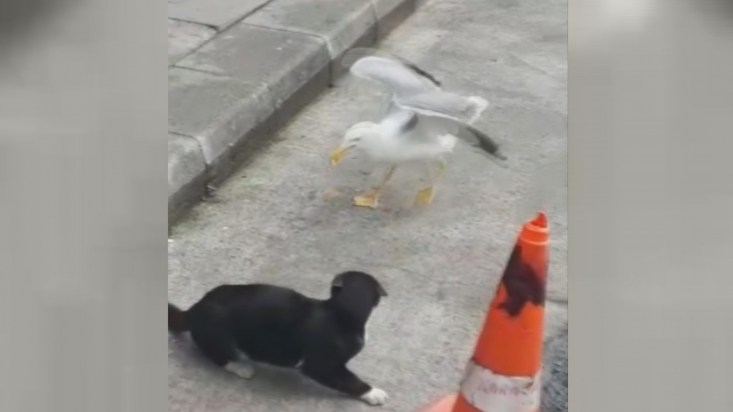 kediye gagası ile saldıran martı kedinin önünden ekmeği alarak yedi. Kedi ile