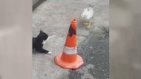 vatandaşın kedi için attığı ekmeğe hamle yapan martı, ekmeği almaya çalışan