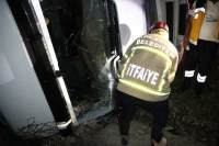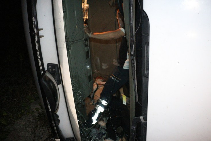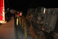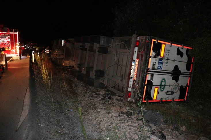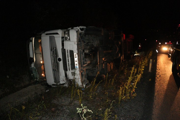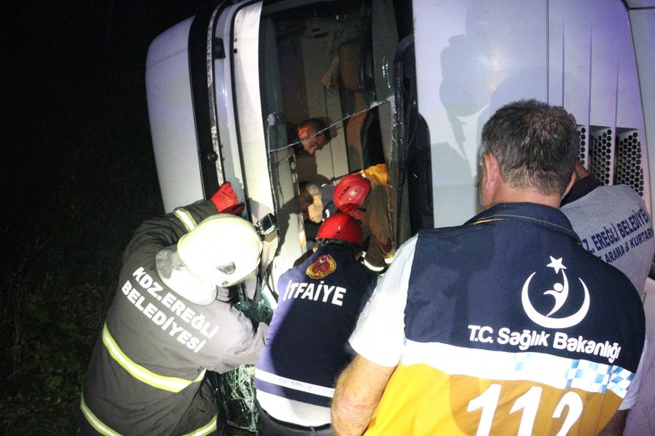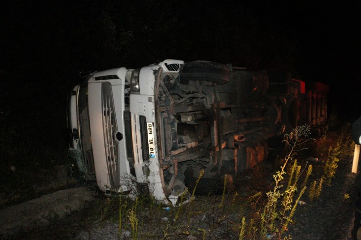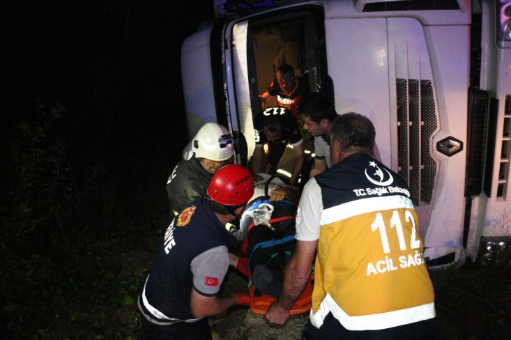 Kaza gece 04.00 sularında Zonguldak İstanbul karayolu Soğanlı rampalarında meydana geldi. Ereğli'den Zonguldak istikametine giden süt firmasına ait H.Ç. nin (55) kullandığı 10 VL 688 çekici 10 VU 262 plakalı TIR, sürücünün direksiyon hâkimiyetini kaybetmesi sonucu yoldan çıkarak devrildi. Kazada yaralanan ve hareket edemeyen sürücü H.Ç. Ereğli Belediyesi İtfaiye Müdürlüğü ekiplerinin yaklaşık 10 dakika süren çalışması sonucu kurtarılarak, aracın kupasından çıkarıldı. sedye ile ambulansa taşınan sürücü, yapılan ilk müdahalenin ardından Ereğli Devlet Hastanesine kaldırıldı. Uyuduğu iddia edilen sürücünün kolunda kırık olduğu ve hayati tehlikesinin bulunmadığı öğrenildi. Çalışma sırasında tek şeritten verilen trafik, tutulan raporların ve ekiplerin kaza yerinden ayrılmasının ardından normale döndü. Savcılık kaza ile ilgili soruşturma başlattı.