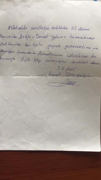 Yıl 2015, genel seçim takvimi işlemeye başladı. Ereğli Armutlucuma ve Civar Köyleri Yardımlaşma Derneğinin düzenlediği toplantıda AKPZonguldak Milletvekili Faruk Çaturoğlu Ereğli-Devrek yolu için el yazısı ile taahhüt imzaladı. Yıl 2016, Öğberler Derneği'nin iftar programında AKP İlçe Başkanı Fatih Çakır, 2018 yılı mart ayı içersinde Ereğli-Devrek bitecek ve kullanıma açılacak dedi.