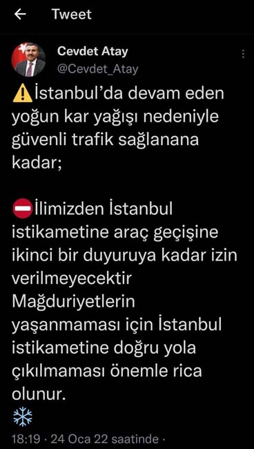 Türkiye genelinde hafta sonu itibarı ile devam eden kar yağışı neticesinde sürücüler zor anlar yaşadı. İstanbul’da devam eden yoğun kar yağışı sebebiyle de Düzce Valisi Cevdet Atay açıklama yaptı. Güvenli trafik sağlanana kadar Düzce’den İstanbul istikametine araç geçişlerine izin verilmeyeceğini açıklayan Vali Atay, vatandaşların mağdur olmaması için bu konuda uyardı.,