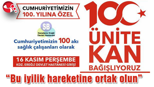 Karadeniz Ereğli Devlet Hastanesi Çalışanları, Cumhuriyetimizin 100.yılı kutlamaları kapsamında 16 Kasım Perşembe günü 100 ünite kan bağışı kampanyası yapacaklarını duyurdu.