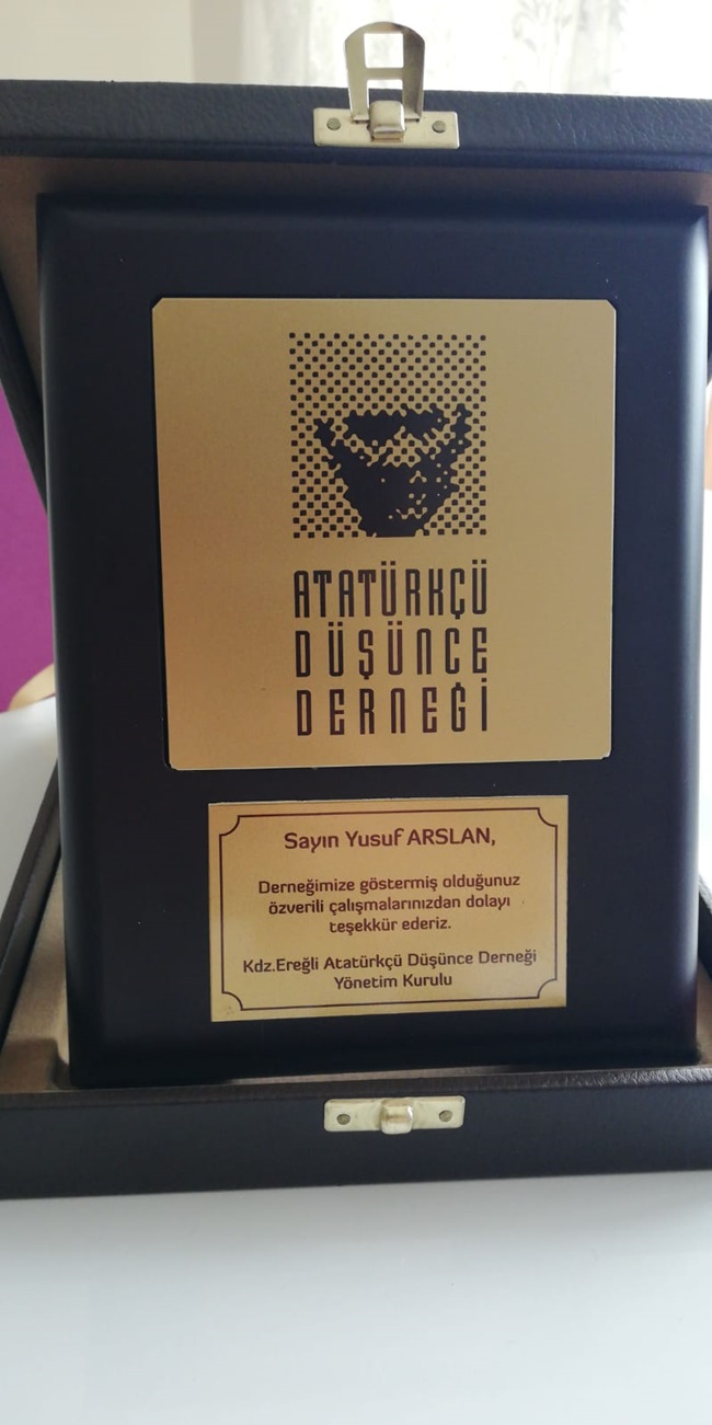 Ayrıca Atatürkçü Düşünce Derneği Yönetim Kurul üyeleri Başkan Yusuf Arslan’a sürpriz bir plaket hazırlatarak, günün anısına teşekkürlerini ilettiler. Bu plaket karşısında çok duygulandım, 1,5 yıldır bu görevi yapıyorum. Benim için Atatürkçü Düşünce Derneği üyesi olmak büyük mutluluk... Dün olduğu gibi bugünde, yarında en güzel prejelerle sizlerle olmaya devam edeceğim.