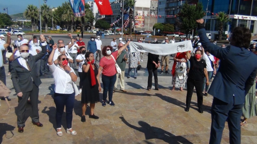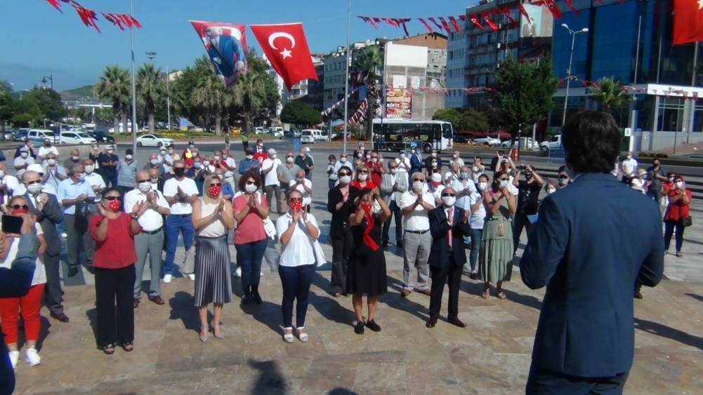 CHP İlçe Başkanı Eylem Ertuğ Ertuğrul öncülüğündeki partililer, Devrim Bulvarı’ndan Atatürk Anıtı’na alkışlarla geldiler.