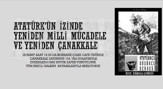 Konuya ilişkin Haber Merkezimize açıklamada bulunan Atatürkçü Düşünce Derneği Karadeniz Ereğli Şube Başkanı Yusuf Arslan, "bu yıl Çanakkale Zaferimizin 104. Yıldönümünü kutlayacağız. Gündüz saatlerinde Karadeniz Ereğli Kaymakamlığınca düzennblenen Anma Programının yanı sıra akşam saatlerinde de saat 19.00'da Bozhane Çilek Cafe önünde Çanakkale Zaferinin 104. yıldönümü nedeniyle Büyük Zafer Yürüyüşünü gerçekleştireceğiz. Yürüyüşe tüm Karadeniz Ereğli halkını davet ediyoruz