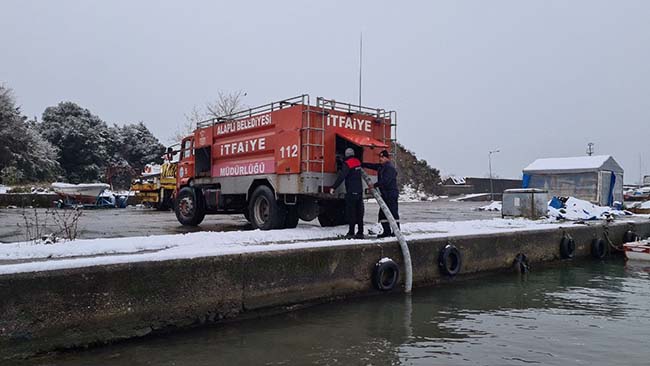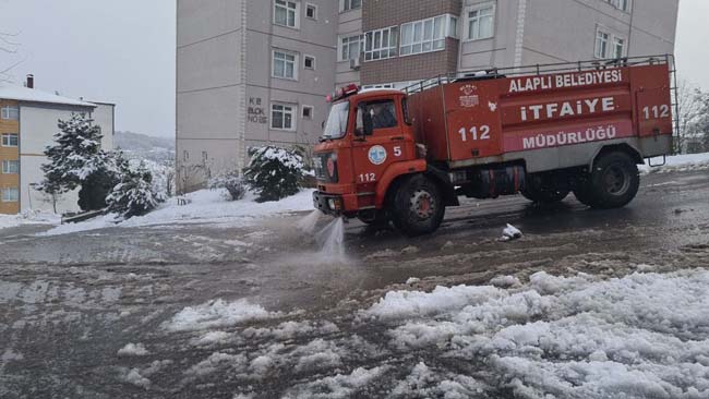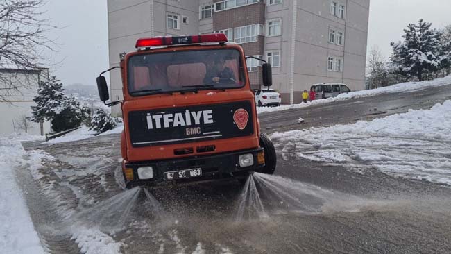 Zonguldak'ın Alaplı ilçesinde yoğun kar yağışı nedeniyle kapanan yollar itfaiye ekiplerinin denizden aldıkları tuzlu su ile açılıyor. Alaplı Belediye Başkanı Tekin,’ Deniz suyu kullanarak buzlanmanın hızlı çözülmesini sağlamak için uzun yıllar bu yöntemi kullanıyoruz’ dedi.