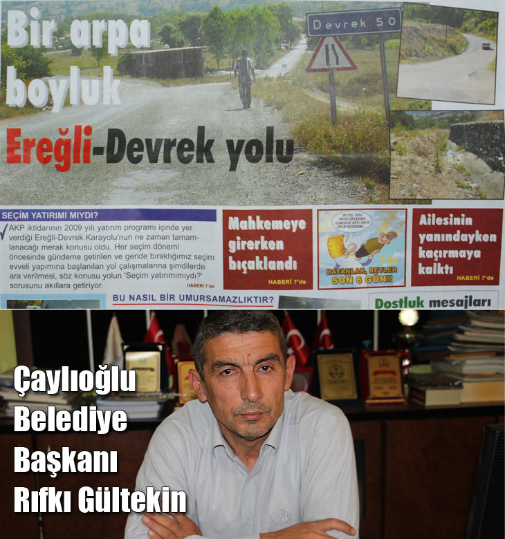 Not: Aşağıda sunulan 'haber fotosu' Gazeteci Şafak Negüzel'in 13 Temmuz 2009 tarihinde yayımlanan 'Seçim Yatırımı mıydı?' başlığı haberinden alıntıdır. O tarihli haberde; dedelerimiz zamanında verilmeye başlanan sözler ve bir türlü yapılamayan Ereğli-Devrek arası yolun her seçim zamanı seçimlere bir yıl kala, yeniden yeniden seçim yatırımı olarak ortaya konulması ancak bir türlü yapılamaması anlatılmıştı.