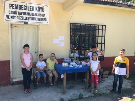 Pembeciler Köyü Cami Yaptırma, Yaşatma ve Köyü Güzelleştirme Derneği önünde stant açan çocuklar; Arda Turan, Menef Ural, Cemre Ergün, Emin Ergün, Nisa Uysal, Yigit Ural, Evre Uysal, bayram harçlıkları ile aldıkları çeşitli yiyecek ve içecek ve kullanılabilecek eşyaları satışa sundular.
