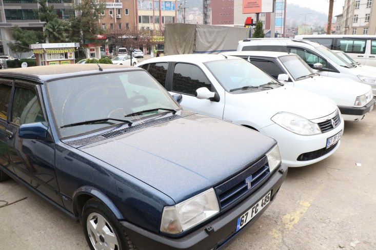 Zonguldak'ta toz taşınımı nedeniyle yağmurla birlikte çamur yağdı. Sabah uyandıklarında araçlarını çamur kaplı gören vatandaşlar şaşkınlık yaşadı.