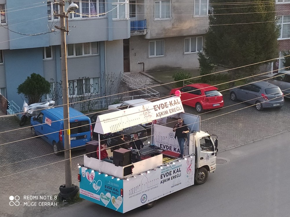 Kdz. Ereğli Belediyesi tarafından evinde kalan çocukları ve aileleri bir nebze rahatlatmak için canlı müziğin yapılacağı ve maskotların balkonlardaki çocukları eğlendireceği ‘Evde Kal Aşkım Ereğli’ aracı yollarda çalışmalarını sürdürüyor.