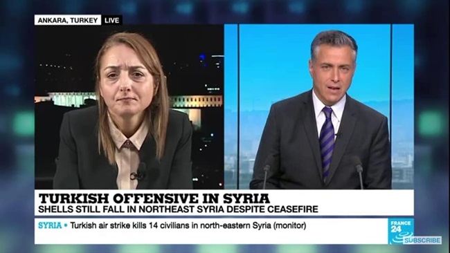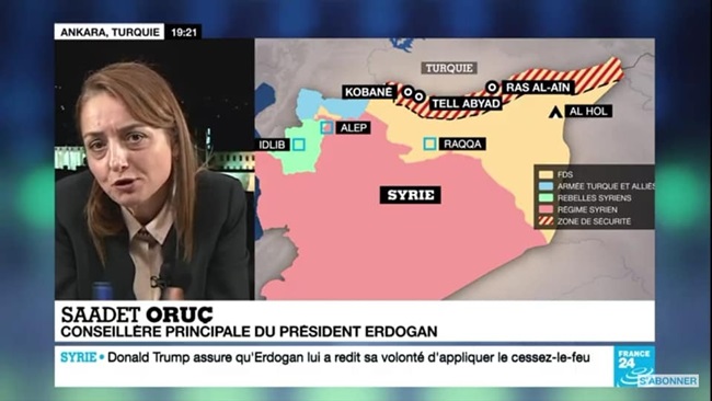 Cumhurbaşkanı Başdanışmanı Saadet Oruç, Türkiye'nin güney sınırında oluşturulmaya çalışılan terör koridorunu yok etmek, bölgeye barış ve huzuru getirmek amacıyla başlatılan Barış Pınarı Harekatı'nı çarpıtmaya çalışan Fransız 24 kanalı sunucusuna verdiği cevaplar sosyal medyanın gündemine oturdu.