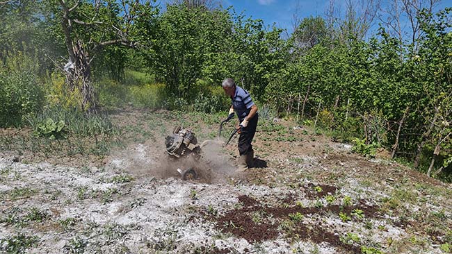 Alaplı ilçesine bağlı Osmanlı köyünde çapa yaparak geçimini sağlayan Rafet Maltepe (56), Ramazan ayında da zorlu mesaisini sürdürüyor. Çapa yaparak çalışmak zorunda olduğunu söyleyen Maltepe, yanında taşıdığı tarım aracıyla çapa yaptırmak isteyen müşterilerine ulaşıyor. Köylülerin tarlalarını çapalayarak evini geçindiren Maltepe, “Bu sene çapa yapmak Ramazan ayına denk geldi. Vatandaşlar bizi çapa yapmak için çağırıyorlar. Genelde her türlü çapa işleri yapıyoruz. Şu an patates ekme mevsimi olduğundan bu işi yapıyoruz. Biz de Ramazan ayında ekmek parası kazanmaya çalışıyoruz” diye konuştu.