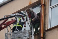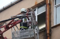 bahçedekiler o anları dikkatle izledi. Bir itfaiye eri, ikinci kata yükseltilen