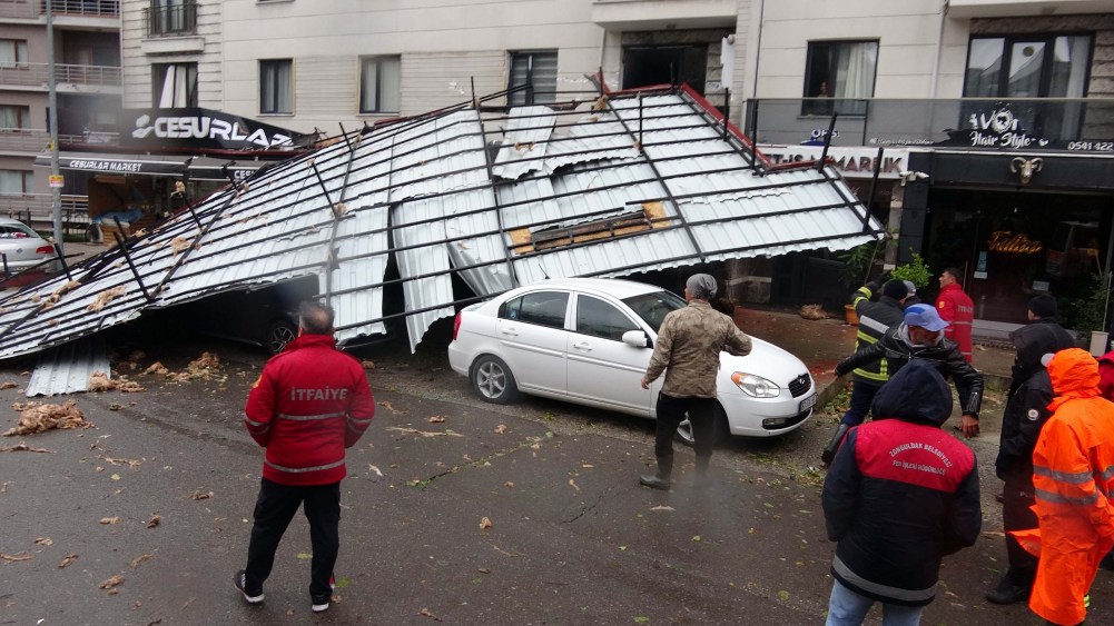 Zonguldak'ta saatteki hızı 80 kilometreyi aşan kuvvetli fırtına sebebiyle bazı evlerin çatıları uçtu. Kopan parçaların altında kalan park halindeki araçlar zarar gördü.