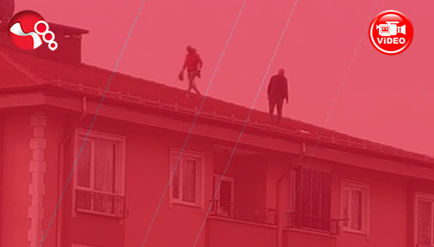 Zonguldak’ın Ereğli ilçesinde iki işçinin şiddetli fırtınaya rağmen çatıda yaptıkları çalışma cep telefonu ile görüntülendi.