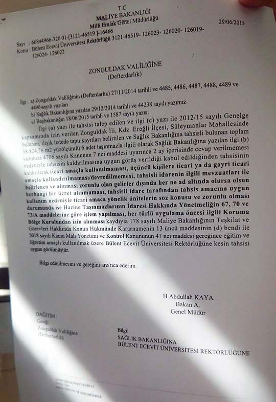 "iİgi (a) yazı ile tahsisi talep edilen ve ilgi (c) yazı ile s2012/15 sayılı Genelge kapsamında izin verilen Zonguldak ili, Kdz. Ereğli ilçesi, Süleymanlar Mahallesinde bulunan, ilişik listede tapu kayıtları belirtilen ve sağlık bakanlığına tahsisli bulunan toplam 38.824.76 metrekare yüzölçümlü 6 adet taşınmazla ilgili olarak sağlık bakanlığına yazılan ilgi (b) yazımıza 4706 sayılı Kanunun 7. Maddesi uyarınca 2 ay içerisinde cevap verilmemesi nedeniyle tahsisin kaldırılmasına uygun görüş verildiği kabul edildiğinden tahsisinin kaldırılarak ticari amaçla kullanılmaması, üçüncü kişilere ticari yada gayri ticari amaçla kullandırılmaması, devredilmemesi, tahsisli idarenin ilgili mevzuatları ile belirlenen ve alınması zorunlu olan gelirler dışında her ne ad altında olursa olsun herhangi bir ücret alınmaması tahsisli idare tarafından tahsis amacına uygun kullanım nedeniyle ticari amaca yönelik ünitelerin söz konusu ve zorunlu olması durumunda ise hazine taşınmazlarının idaresi hakkında yönetmeliğin 67,70 ve 73 A maddelerine göre işlem yapılması, her türlü uygulama öncesi ilgili foruma bölge kurulundan izin alınması kaydıyla 178 sayılı maliye bakanlığının teşkilat ve görevleri hakkında kanun hükmünde kararnamenin 13. Maddesinin (D) bendi ile 5018 sayılı kamu mali yönetimi ve kontrol kanununu 47. Maddesi gereğince eğitim ve öğretim amaçlı kullanılmak üzere Bülent Ecevit Üniversitesi Rektörlüğüne kesin tahsisi uygun görülmüştür."dedi