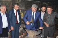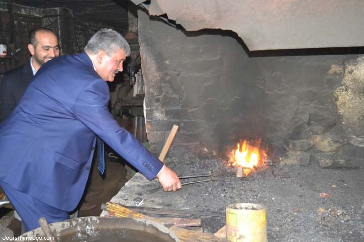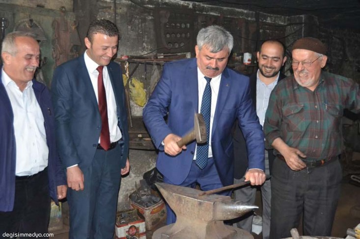Milletvekili Adayı Çaturoğlu'nun, bir demirci dükkânını ziyaretinde, çekici eline alarak demir dövmesi renkli görüntülere sahne oldu.