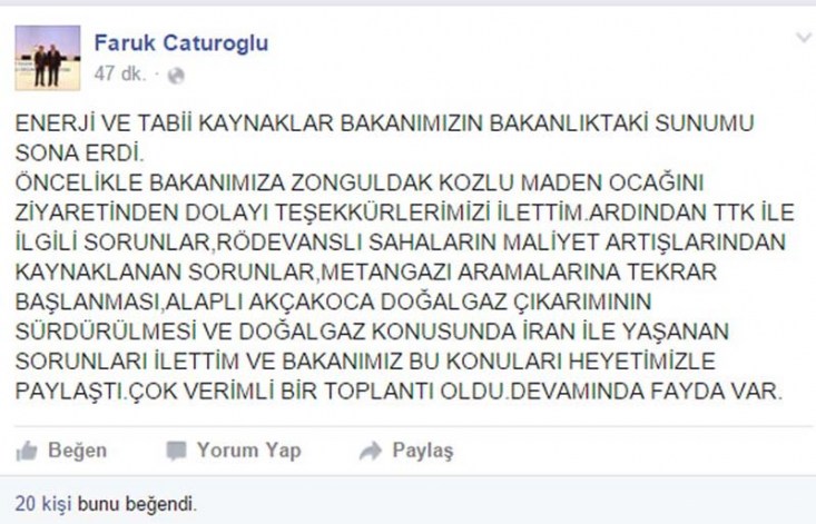 "Enerji ve tabii kaynaklar bakanımızın bakanlıktaki sunumu sona erdi. Öncelikle bakanımıza Zonguldak Kozlu maden ocağını ziyaretinden dolayı teşekkürlerimizi ilettim. Ardından TTK ile ilgili sorunlar, rödevanslı sahaların maliyet artışlarından kaynaklanan sorunlar, metan gazı aramalarına tekrar başlanması, Alaplı, Akçakoca doğalgaz çıkarımının sürdürülmesi ve doğalgaz konusunda İran ile yaşanan sorunları ilettim ve bakanımız bu konuları heyetimizle paylaştı. Çok verimli bir toplantı oldu."
